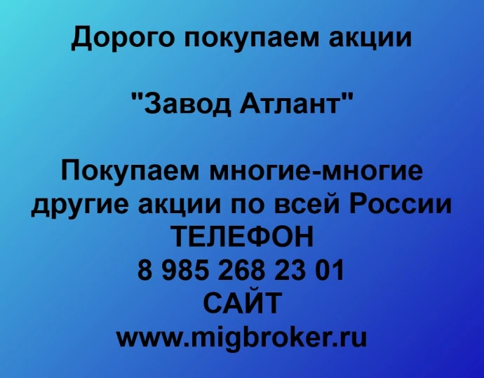 У нас лучшая цена акций «Завод Атлант». Стоимость акций «Завод Атлант» исходя из котировки на сегодня. Покупаем акции «Завод Атлант» в любом городе. Расчет сразу, отсутствие каких либо комиссий, прозрачная сделка на всех этапах. Если Вы хотите продать акции «Завод Атлант», звоните.
